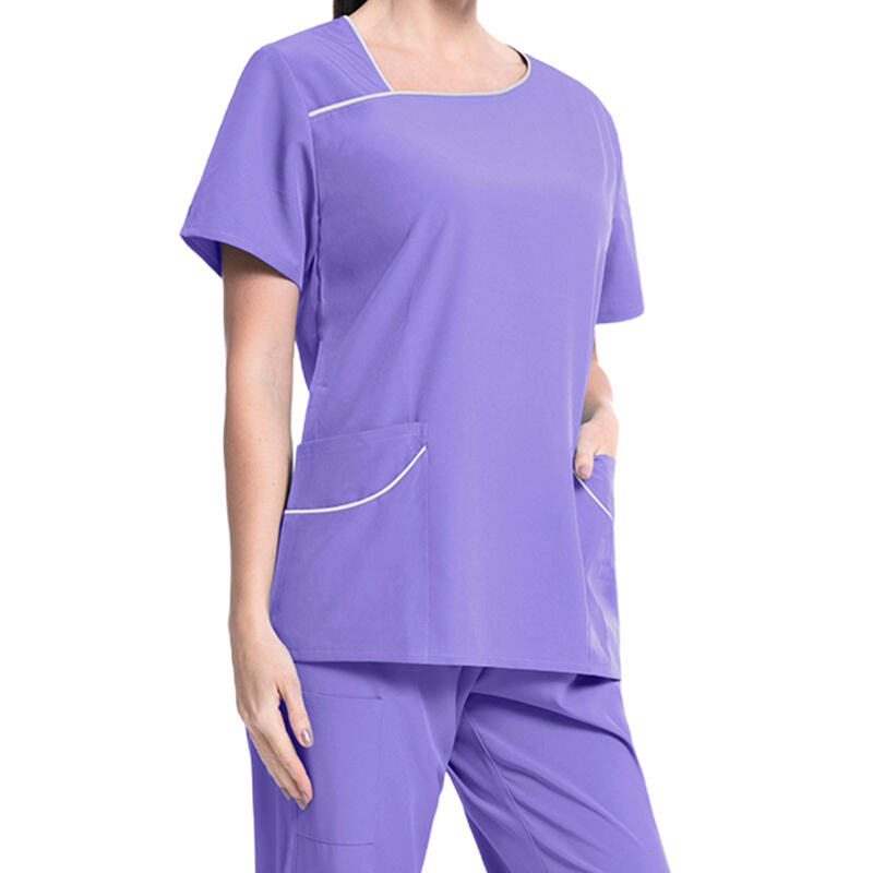 - The simple design of the asymmetrical neckline adds a touch of sophistication to its professional look and can alleviate patient anxiety.