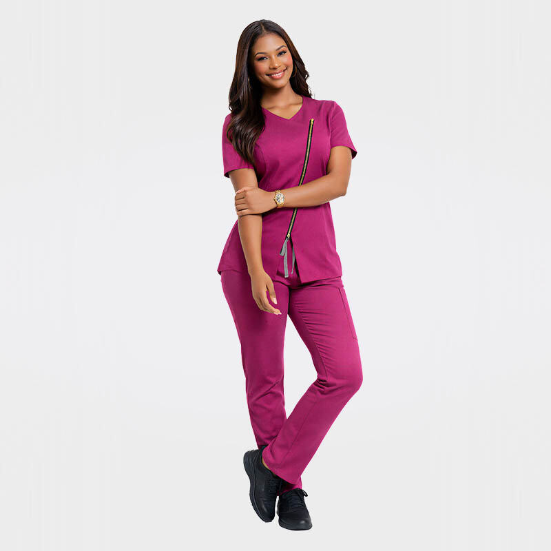 Its diagonal zip and irregular curved hem add a distinctive touch, while breathable stretch fabric ensures all-day comfort during long shifts. The adjustable drawstring waist and ankle zippers deliver a secure, flexible fit, and diagonal side pockets keep medical essentials handy. This is more than a uniform—it’s a reliable ally that lets healthcare professionals focus on delivering great care.