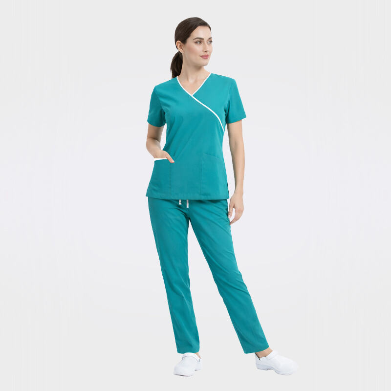Stylish Contrast Design: Classic V-neck scrub top featuring distinct white contrast piping along the neckline and front crossover.